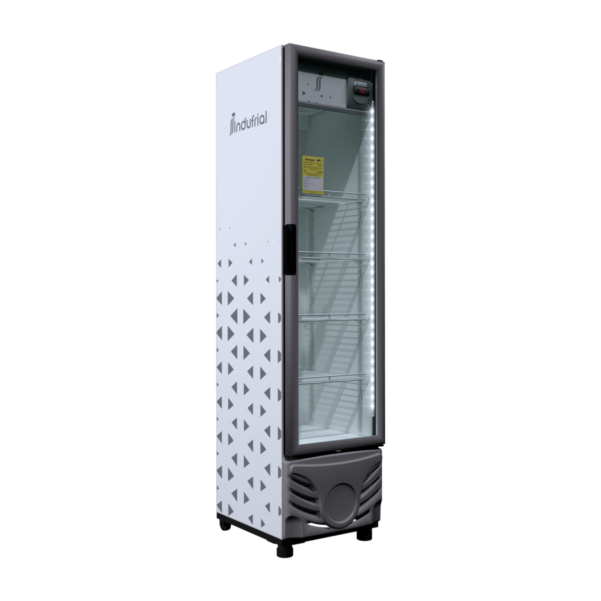 Display case with generous storage capacity and an interchangeable top screen for displaying advertising.